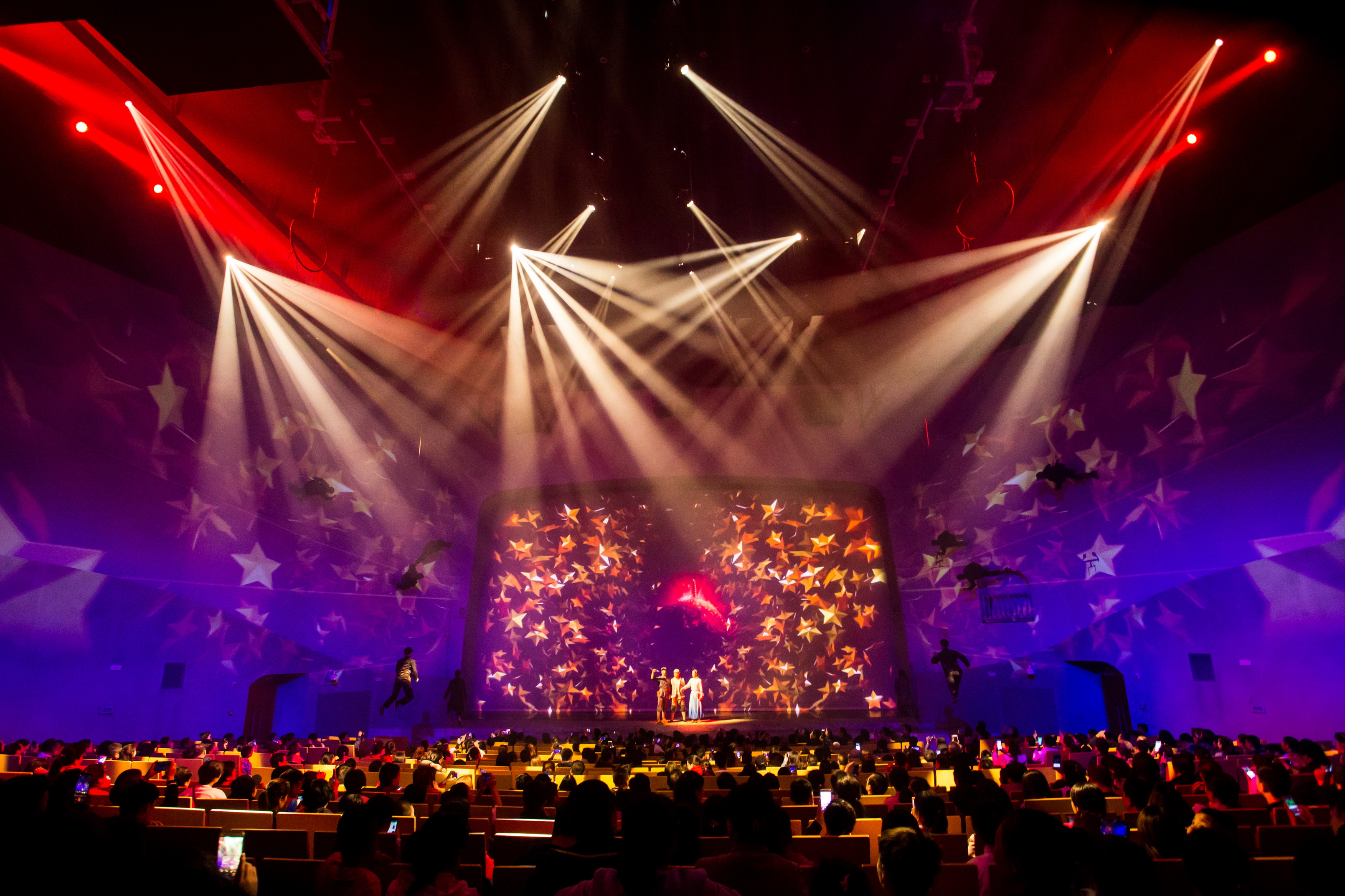 突破了传统剧院镜框式的舞台表现形式,充分利用观众区顶部马道和侧墙,用影像、维亚、局部表演窗口等多种现代舞台科技手段及视频、虚拟影像等多媒体形式,将高科技舞台机械与量身定制的剧院建筑、设备的运用融为一体,使观众席成为第二表演空间,让观众轻松、愉悦地“被带入”观演,形成了“戏在身边,人在戏中”的剧场格局。实现了红色题材、观演关系、剧场界限、表演形式四个方面的重大突破。