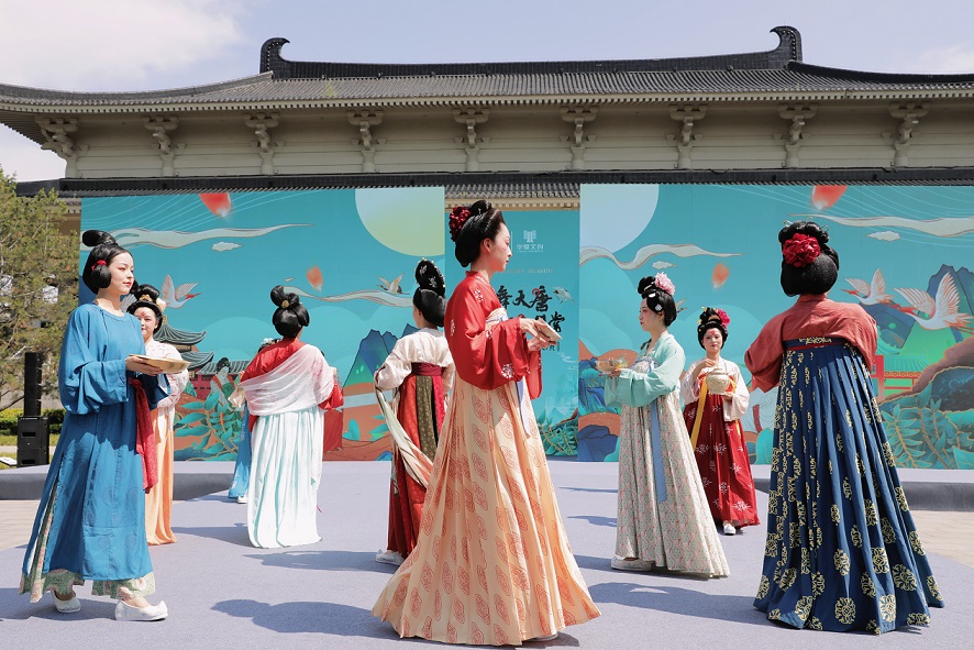 “花舞大唐”主题活动通过“锦绣长安”“风之妆”“雅之饰”和“颂之语”四个篇章,借助贴合现代审美的动静态文创秀形式,对“花舞大唐”IP及其系列产品进行生动诠释。通过富于文物内涵的设计立意、巧思独具的妆效造型、婀娜蹁跹的盛唐乐舞,在现场营造出“盛世大唐”的文化意象。