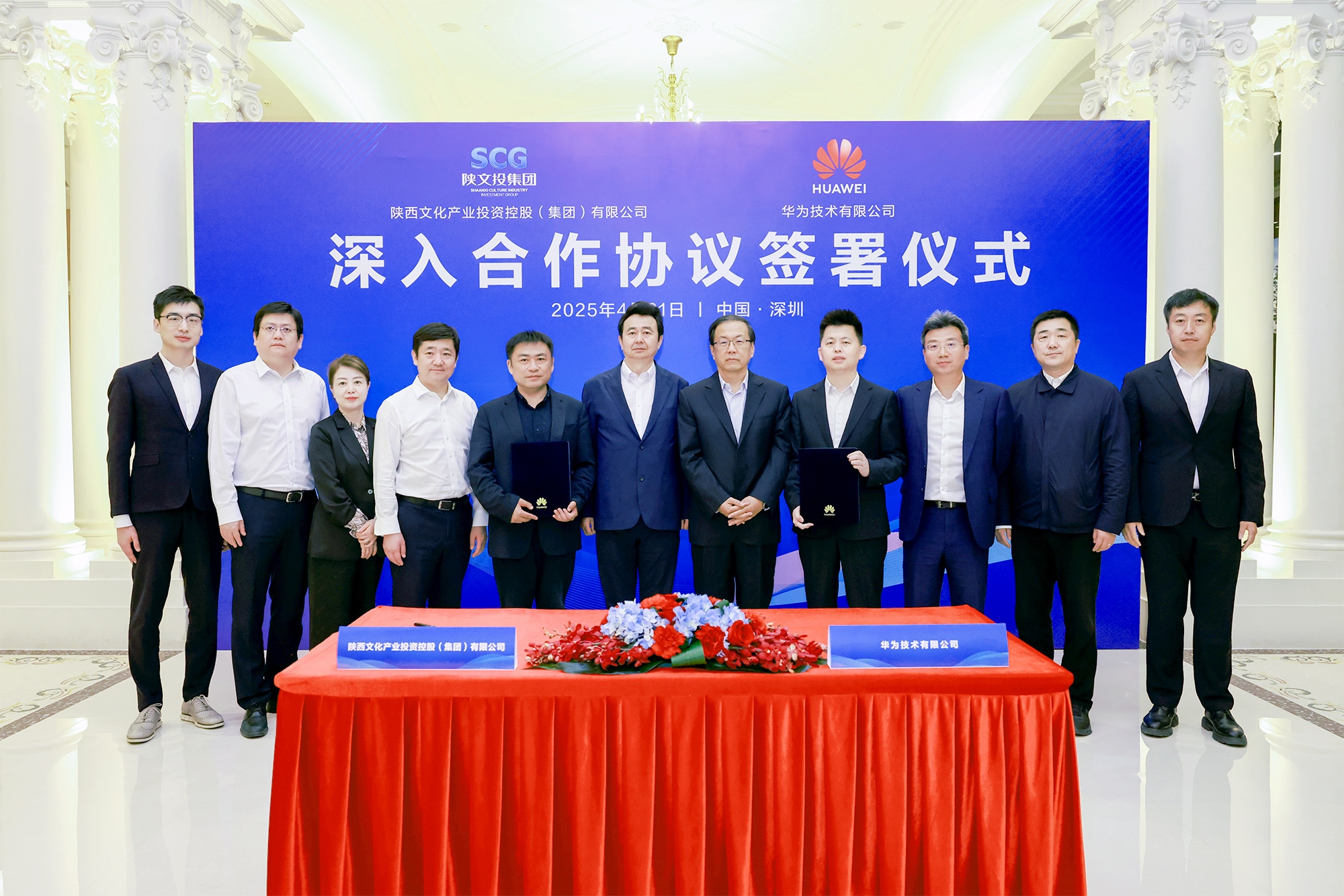 4月21日,陕西文化产业投资控股(集团)有限公司(以下简称“陕文投集团”)与华为技术有限公司(以下简称“华为”)签署深入合作协议。陕文投集团党委书记、董事长黄勇,华为高级副总裁邹志磊见证签约。陕文投集团党委委员、副总经理徐晋,华为陕西政企总经理刘嘉佳代表双方签约。