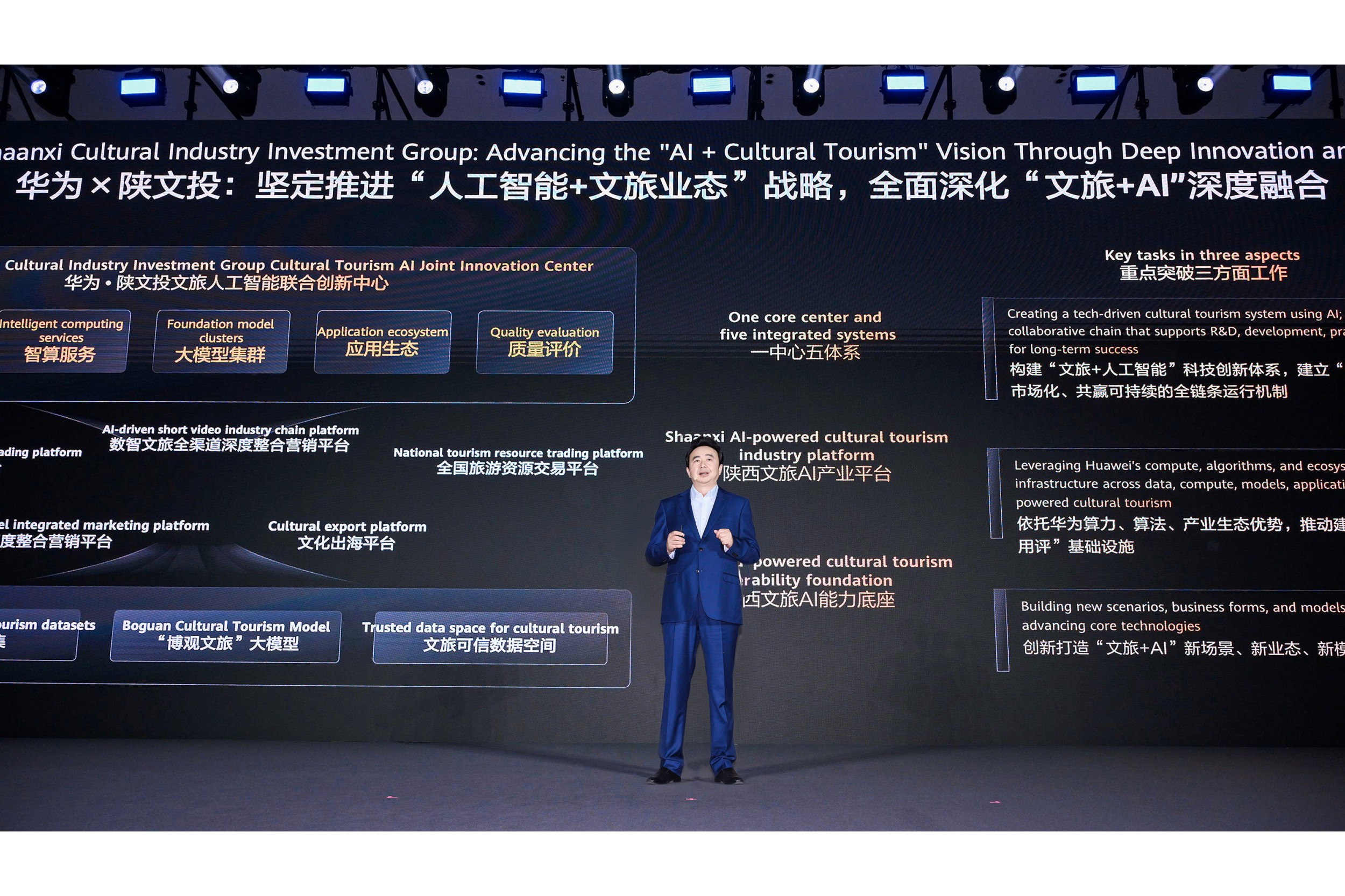 黄勇表示,当前,文化旅游产业展现出巨大的发展潜力和广阔的市场空间,正迎来一个黄金窗口期。陕文投和华为将围绕打造全国首个“文旅+AI”产业高地,在全面构建“文旅+AI”科技创新体系,全面建设“文旅+AI”应用和生态平台,全面建立“文旅+AI”商业模式解决方案标准化、产品化的复制输出机制,全面打造“文旅+AI”人才实训基地,全面实施“文旅+AI”文化出海战略等五个重点方向,加快推进“文旅+AI”深度融合,实现人工智能在文旅产业链全方位应用。