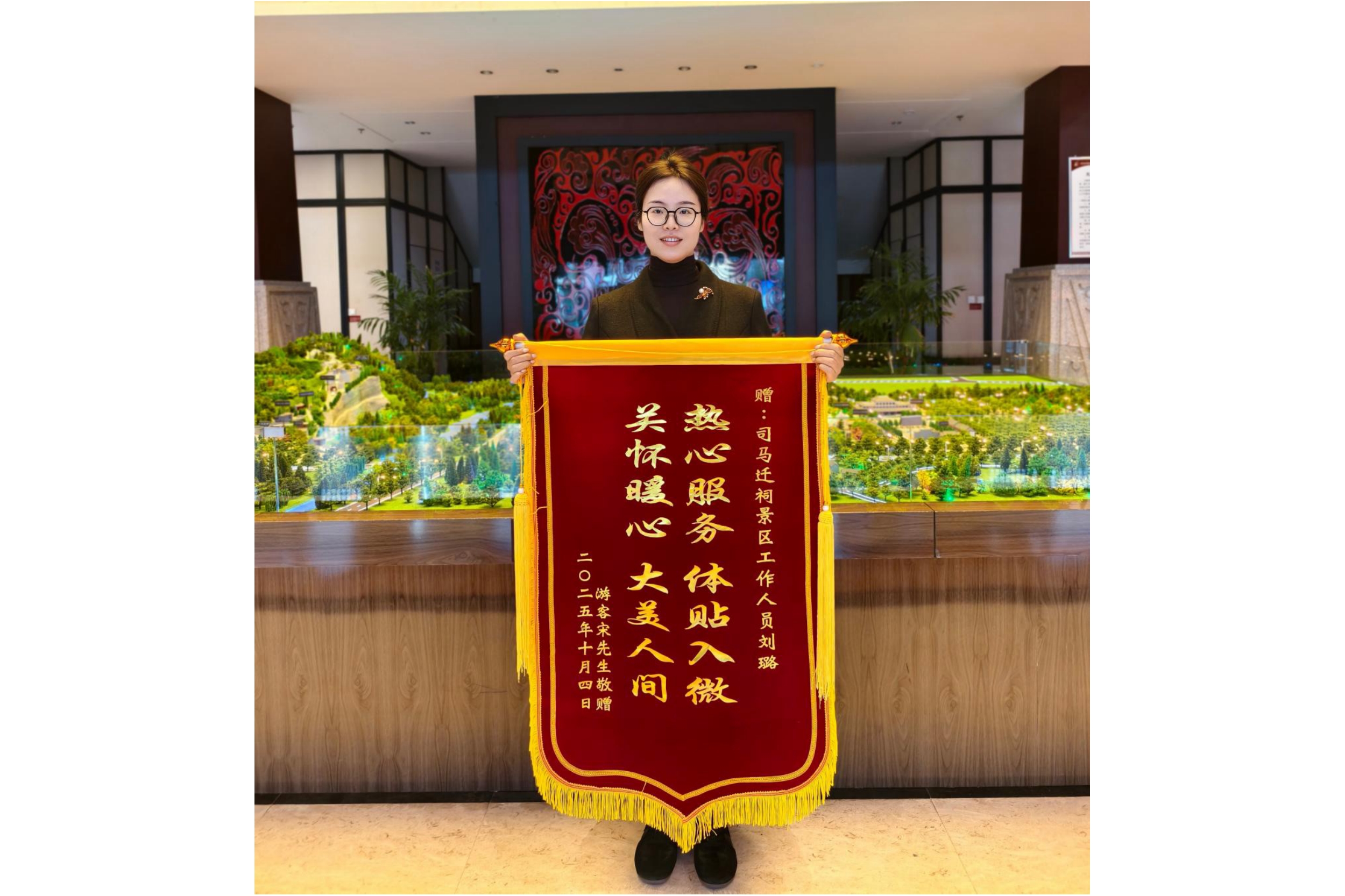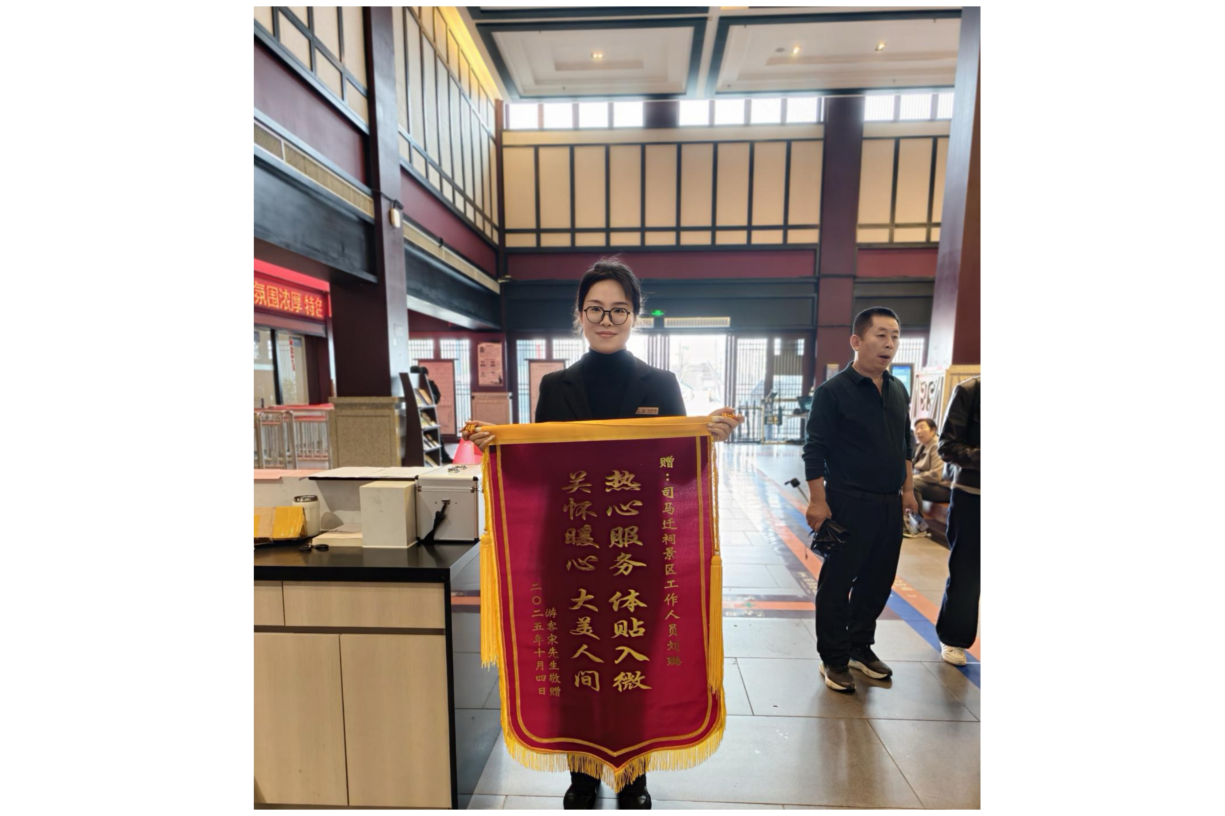 在刚刚过去的“十一”黄金周,司马迁祠不仅高效完成了繁重的游客接待任务,更以一系列细致入微、温暖人心的优质服务,收获了游客的高度赞誉与真诚认可。节后,景区接连收到两面特殊的匿名致谢锦旗,每一面锦旗背后,都承载着一段动人的服务故事,彰显了景区“游客至上”的服务宗旨。